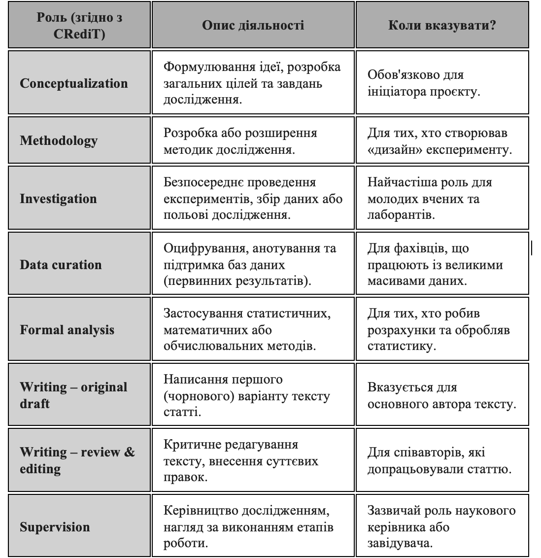 Щоб уникнути суб'єктивності, сучасна світова наука перейшла від загальних фраз до конкретної таксономії ролей. Нижче наведено таблицю, яка допоможе вам чітко визначити, хто і за що відповідав у процесі підготовки статті.