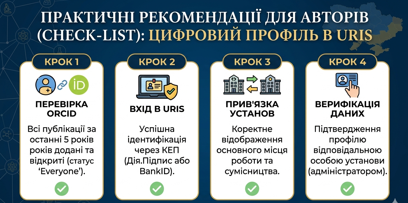 Таким чином, підтримка актуальності власного цифрового профілю в системі URIS перетворюється з формальної вимоги на дієвий інструмент розбудови професійного авторитету вченого, що сприяє ефективному управлінню науковим капіталом у сучасних умовах відкритої науки.